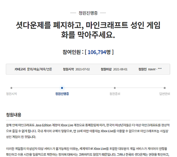 마인크래프트 셧다운제 청와대 국민청원 많은 분들에게 이 영상을 공유 해주세요 Youtube